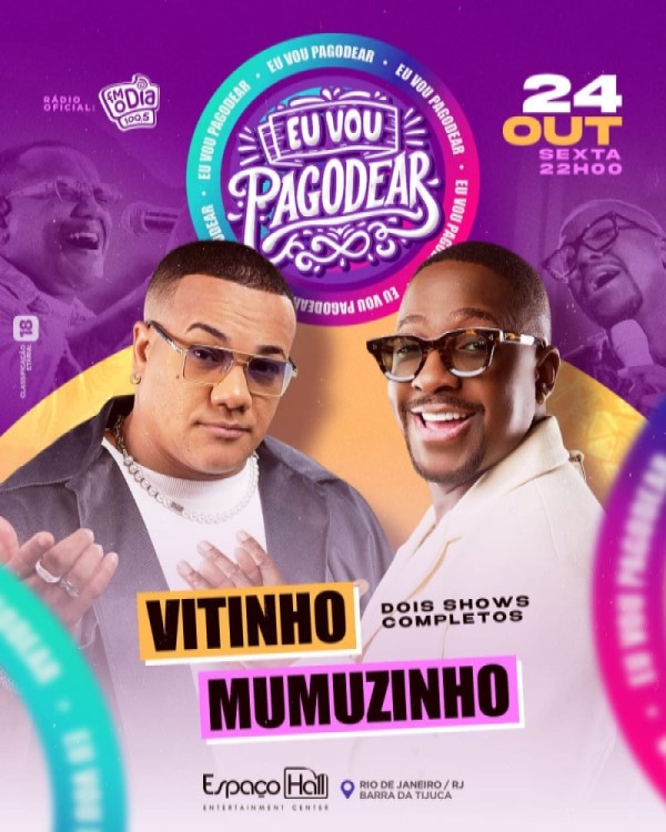 Nesta sexta-feira (24), o Espaço Hall recebe o “Eu Vou Pagodear”, que garante uma noite com o melhor da música brasileira e em dose dupla, com os grandes nomes no cenário do pagode: Mumuzinho e Vitinho.