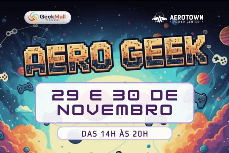 Neste sábado, 29 de dezembro, o Aerotown recebe um evento destinado aos amantes da cultura geek, o Aero Geek. O evento é gratuito e conta com feira geek, quiz interativo, arena gamer, desfile de cosplays, apresentações de k-covers e muito mais do universo nerd.