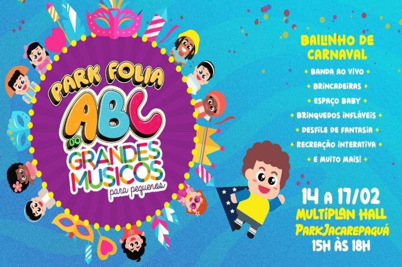 Entre os dias 14 e 17 de fevereiro, das 15h às 18h, acontece o Park Folia: ABC do Grandes Músicos para Pequenos, premiado projeto que tem como objetivo apresentar de forma lúdica e educativa grandes artistas para as crianças. Com banda ao vivo, repertório que mistura marchinhas tradicionais e grandes sucessos da MPB em ritmo de Carnaval, o evento reúne ainda brincadeiras, recreação, espaço baby, brinquedos infláveis e outras atividades, como desfile de fantasias.