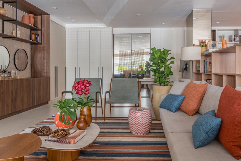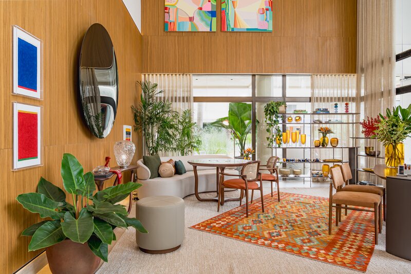 No ambiente da Artefato, a decoradora Bia Seiler transforma o local a partir de texturas em tons vibrantes e quentes, além da tonalidade verde das plantas. Os quadros acrílicos e coloridos de Ricardo Homem e as pinturas em óleo de Romilda Pérez integram a decoração e harmonizam o espaço. “A arte também pode florescer em ambientes cheios de vida e contraste, não apenas em composições monocromáticas”, explica Bia.